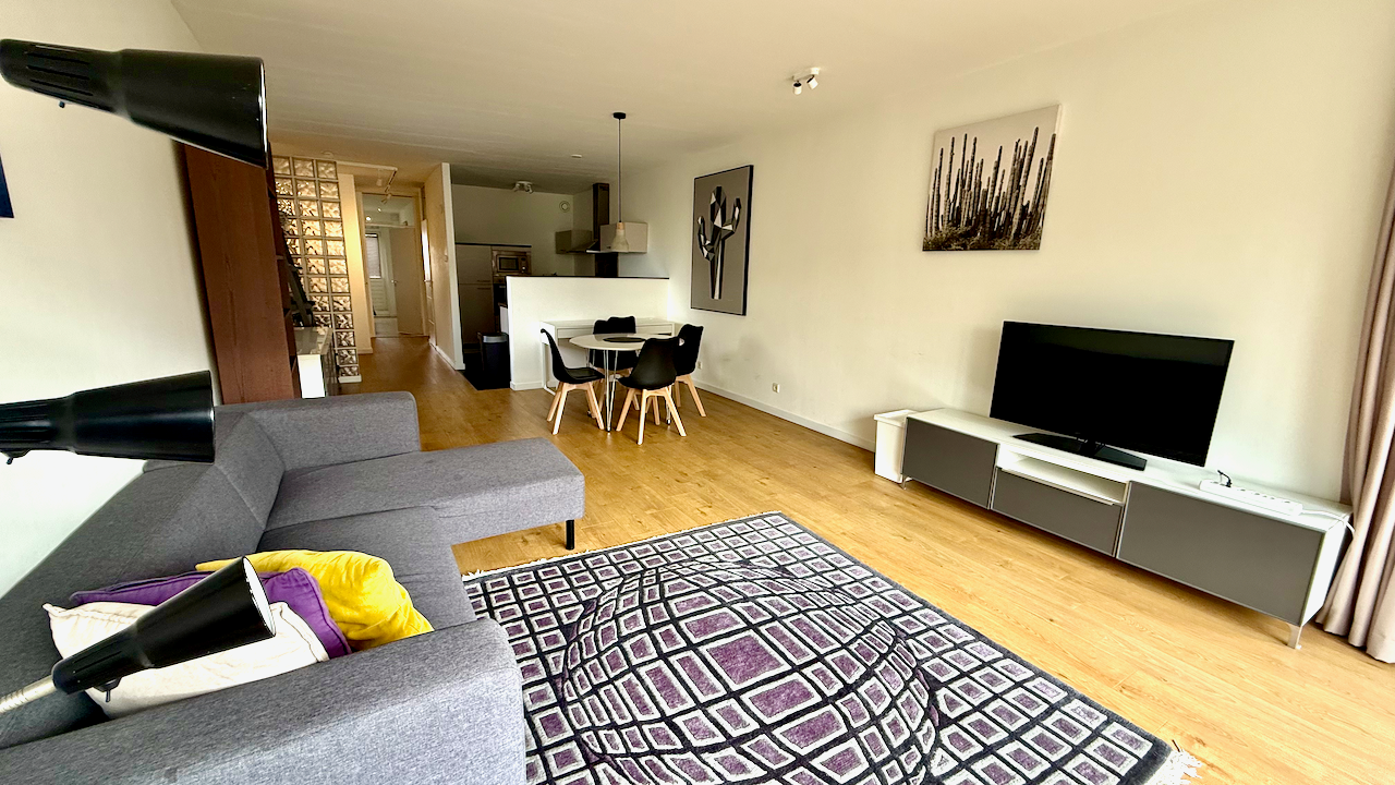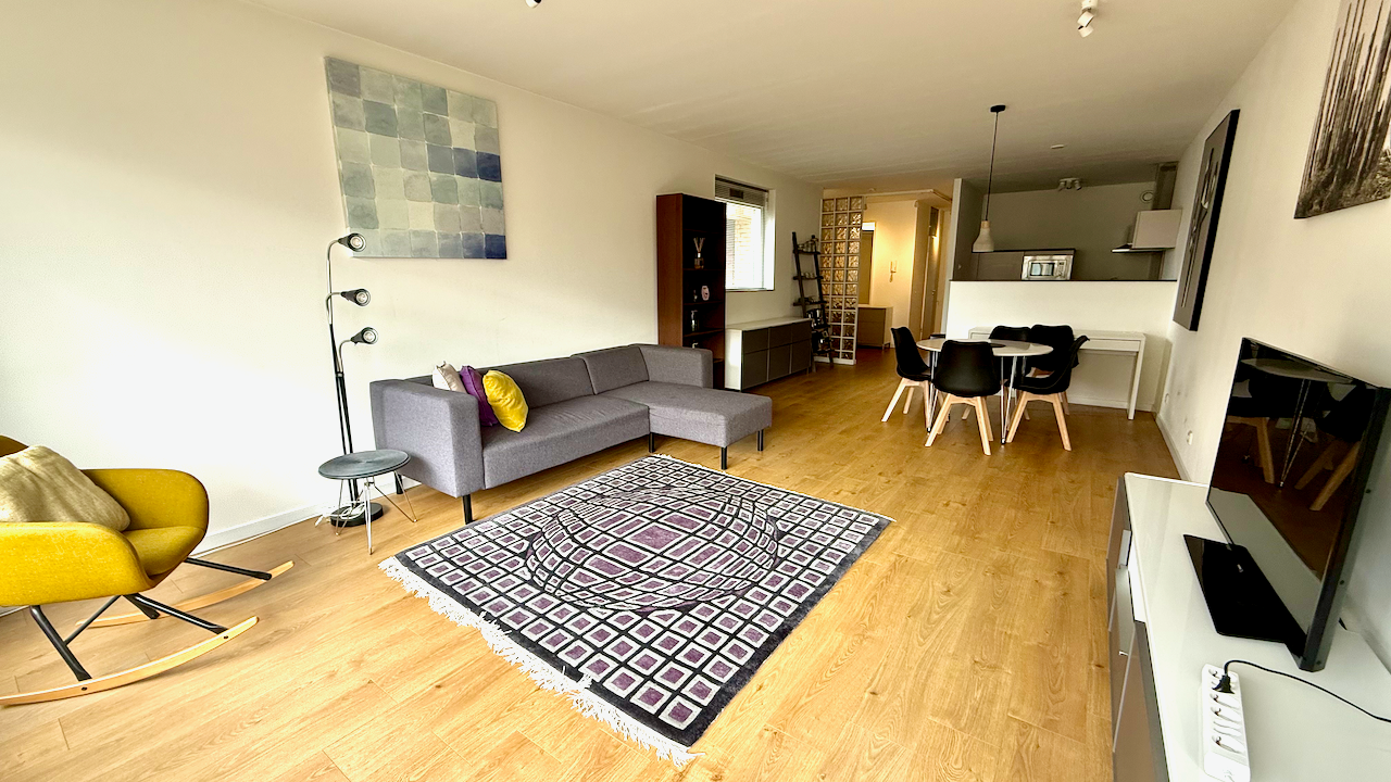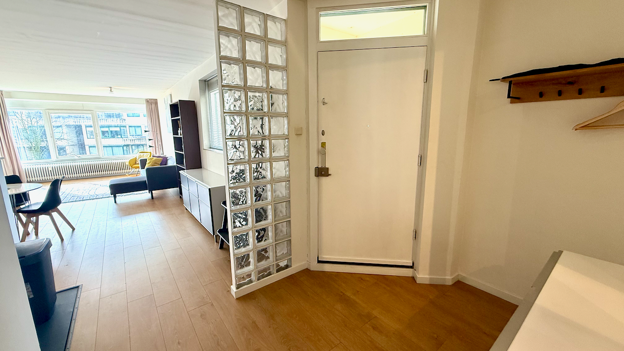 Shared main entrance with elevator to the 4th floor. Entrance to the apartment with a hallway and doors to all the rooms. Spacious and bright living room with doors to the balcony. Tastefully decorated and furnished. Open kitchen with bar and appliances such as dishwasher, oven, microwave, sink, freezer / fridge, induction stove and ample storage space. Master bedroom with big windows, a wardrobe and comfortable double bed. The 2nd bedroom can be used as a study or home office or sleeping room. Bathroom with walk-in shower, towel radiator and sink. Seperate toilet with faucet. A washing machien / dryer combination is available. Centrally heated and laminate flooring throughout the apartment. Fully double glazed.