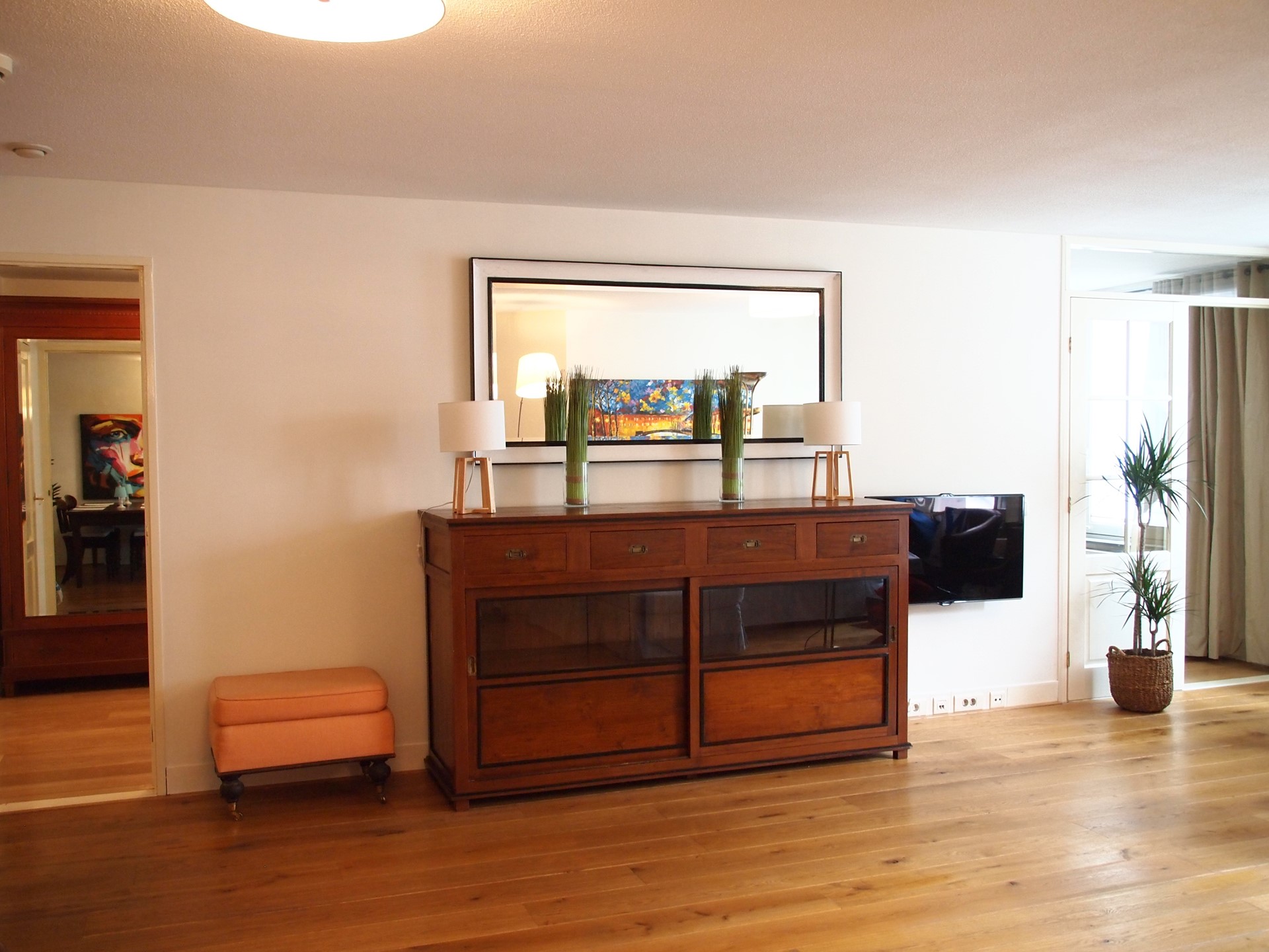 Well maintained common entrance with bells and mailboxes, hall, entrance apartment, hall, small bedroom, toilet and cupboard with washing machine, dryer and city heating system. Spacious living / dining room with open kitchen, fully equipped, large bedroom with ensuite bathroom with bath and shower. Second bedroom can be used as study or guest bedroom. In the basement is a private storage and communal bike storage.