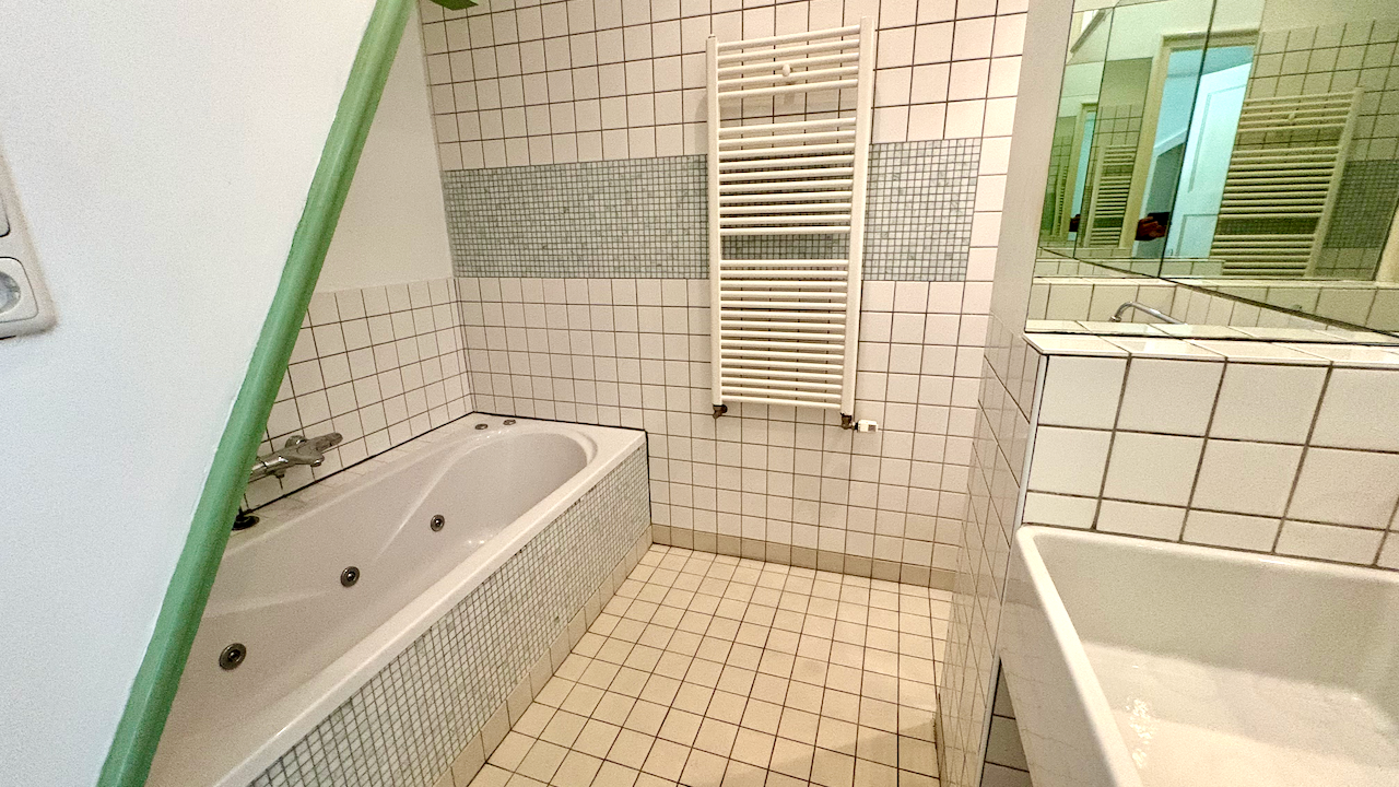 The property features a generous living room that can easily be divided into a separate sitting area and dining room, creating a pleasant and spacious living environment. The separate kitchen is equipped with built-in appliances and includes a washing machine and dryer. On the ground floor you will also find the first spacious bedroom and a modern bathroom fitted with a bathtub and walk-in shower. A separate toilet is also located on this floor.
