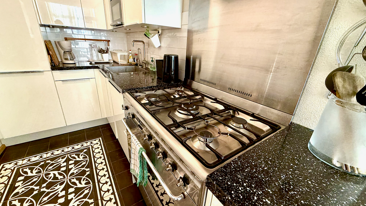The L-shaped kitchen is spacious and contains luxury appliances and high quality finish. The kitchen is equipped with a dishwasher, double sink, large fridge+freezer combi, 5-pit burner stove and a long granite countertop.