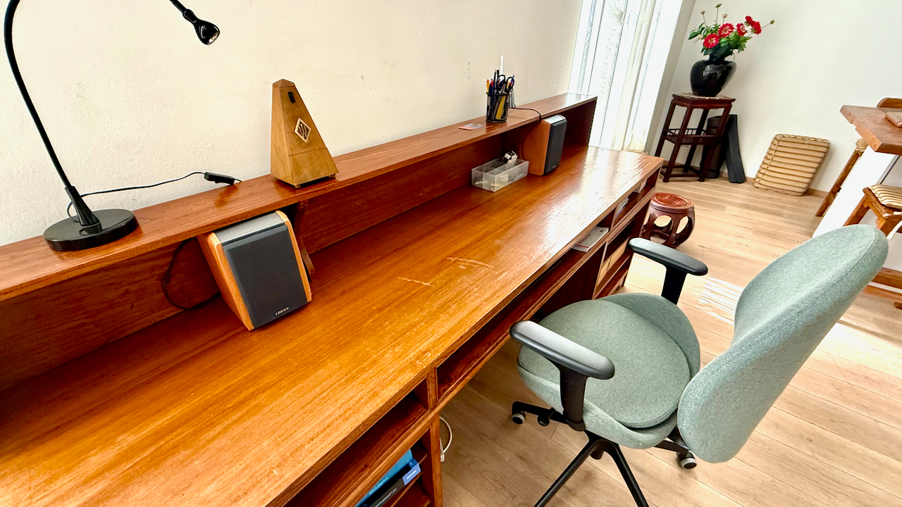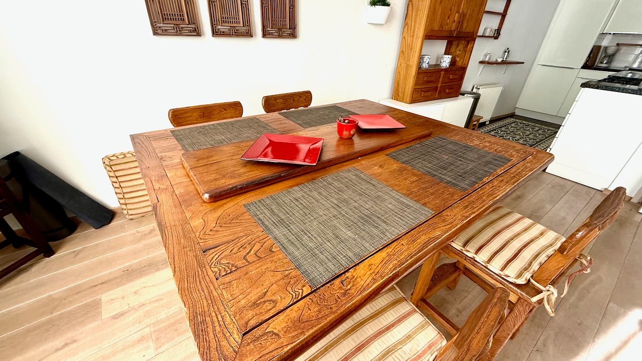 The historic building overlooks a characteristic square on the street side, through which the elegant entrance to the apartment complex can be accessed. Behind the classic front doors is a large hall with doorbells, intercom and mailboxes. The apartment door is located on the left side after entering the complex. Through the front door is a large hallway that leads into the living room. The living room stretches to the largest width of the apartment and features tall windows looking out over the street side, making the room bright and open. The dining area features an elevated table with characteristic wooden tabletop and the semi-open kitchen is situated next to the dining table.